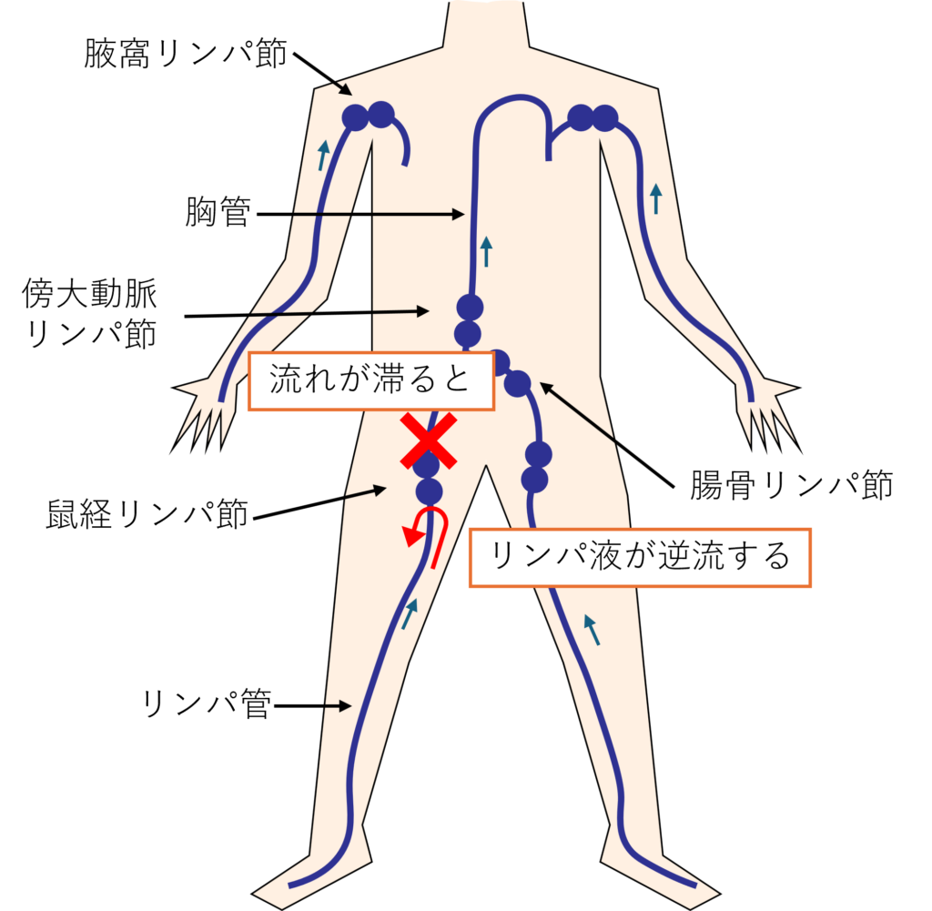 しかし、何らかの原因でリンパ管やリンパ節の機能が低下すると、流れが滞り、「リンパ液のうっ滞 ⇒ リンパ浮腫」が起こります。