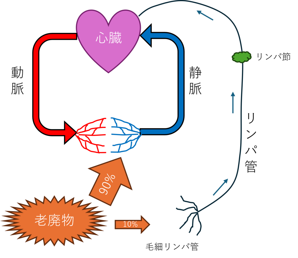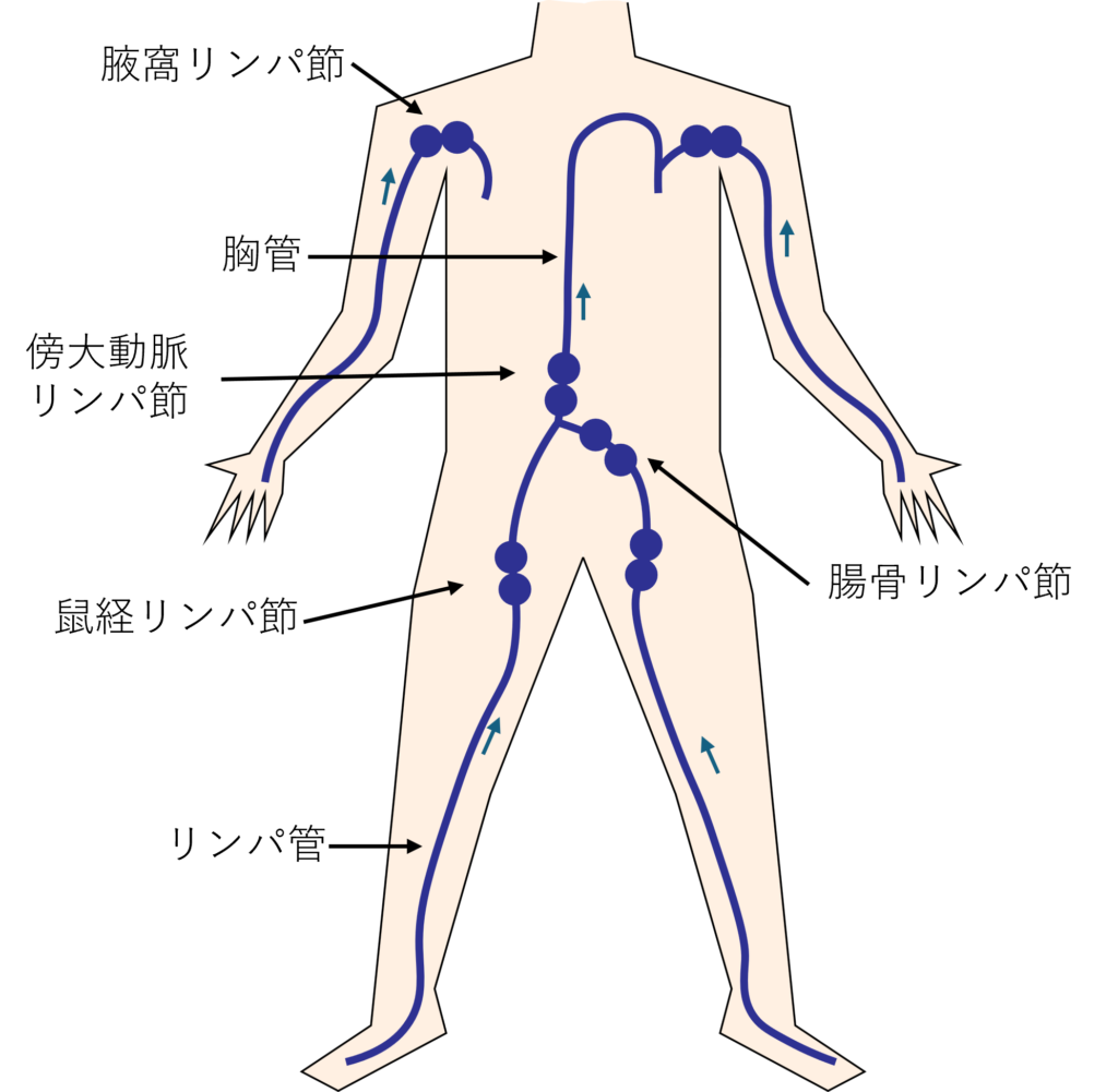 リンパ液は、抹消(手や足)から始まり、毛細リンパ管から吸収され、リンパ節を経て静脈系に戻ります。